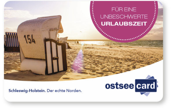 Für eine unbeschwerte Urlaubszeit an der Ostseeküste Schleswig-Holsteins setzen Sie in Ihrem Urlaub jetzt alles auf eine Karte. Denn mit der Ostseecard profitieren Sie von jeder Menge exklusiven Angeboten, Rabatten und attraktiven Vergünstigungen. In 18 Orten warten über 30 Partner mit attraktiven Angeboten und Vergünstigungen auf Sie.
